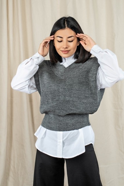 З цією в'язаною жилеткою можна придумати десятки образів і комбінацій.Її сміливо можна надіти з гольфом, сорочками чоловічого крою, сукнями та блузами. Виконана в нюдових кольорах, які підійдуть до будь-якого луку.