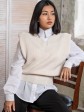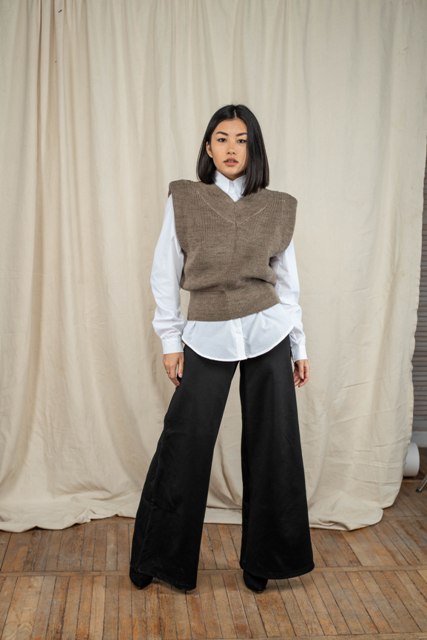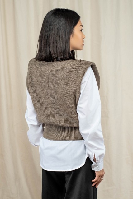 З цією в'язаною жилеткою можна придумати десятки образів і комбінацій.Її сміливо можна надіти з гольфом, сорочками чоловічого крою, сукнями та блузами. Виконана в нюдових кольорах, які підійдуть до будь-якого луку.
