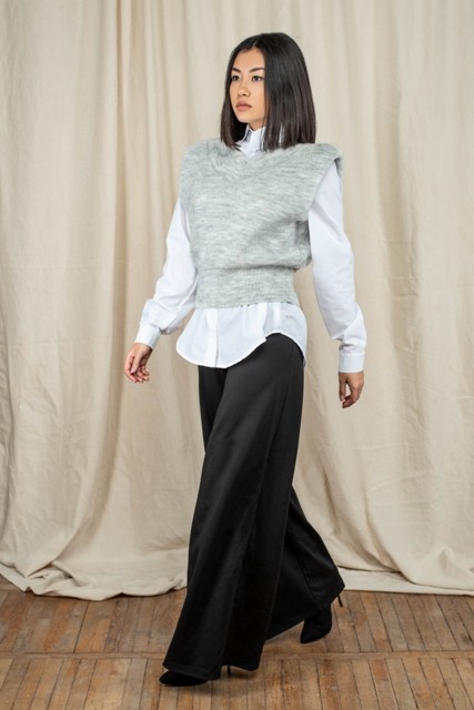 З цією в'язаною жилеткою можна придумати десятки образів і комбінацій.Її сміливо можна надіти з гольфом, сорочками чоловічого крою, сукнями та блузами. Виконана в нюдових кольорах, які підійдуть до будь-якого луку.