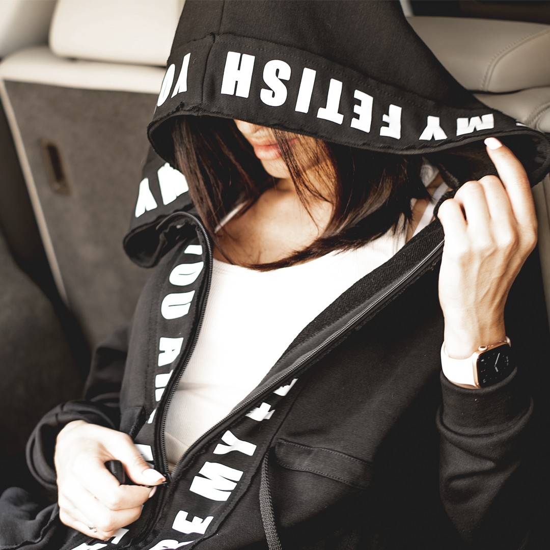 Суперстильна модна кофта з капюшоном, виконана з турецької трьохнитки.По окантовці змійки і капюшона напис:"You are my fetish".