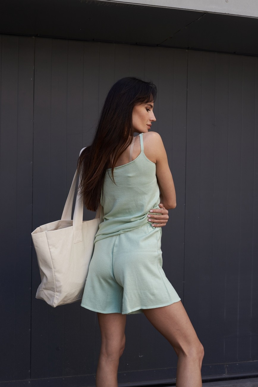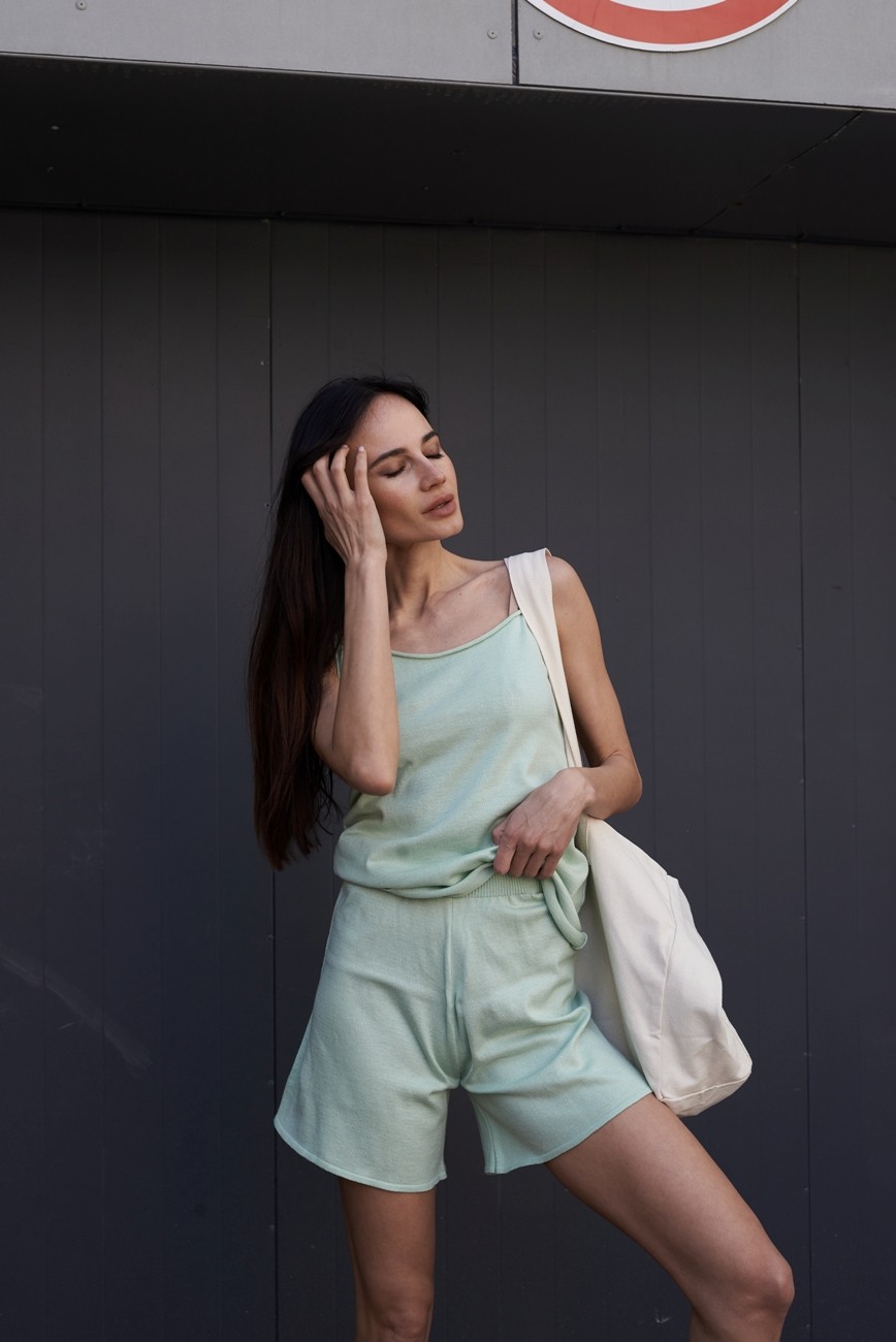 Тоненький м'який в'язаний костюм складається з шорт на резинці та майки.