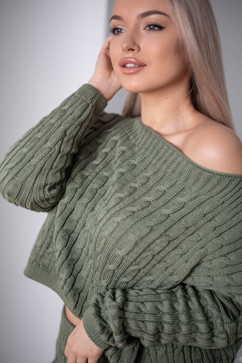 В'язаний жіночий костюм - Спідниця міні і светр вільного крою - машинна в'язка - "Адель" - Хакі