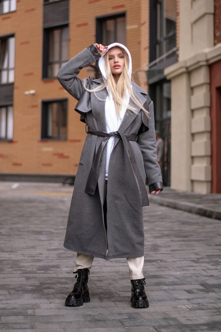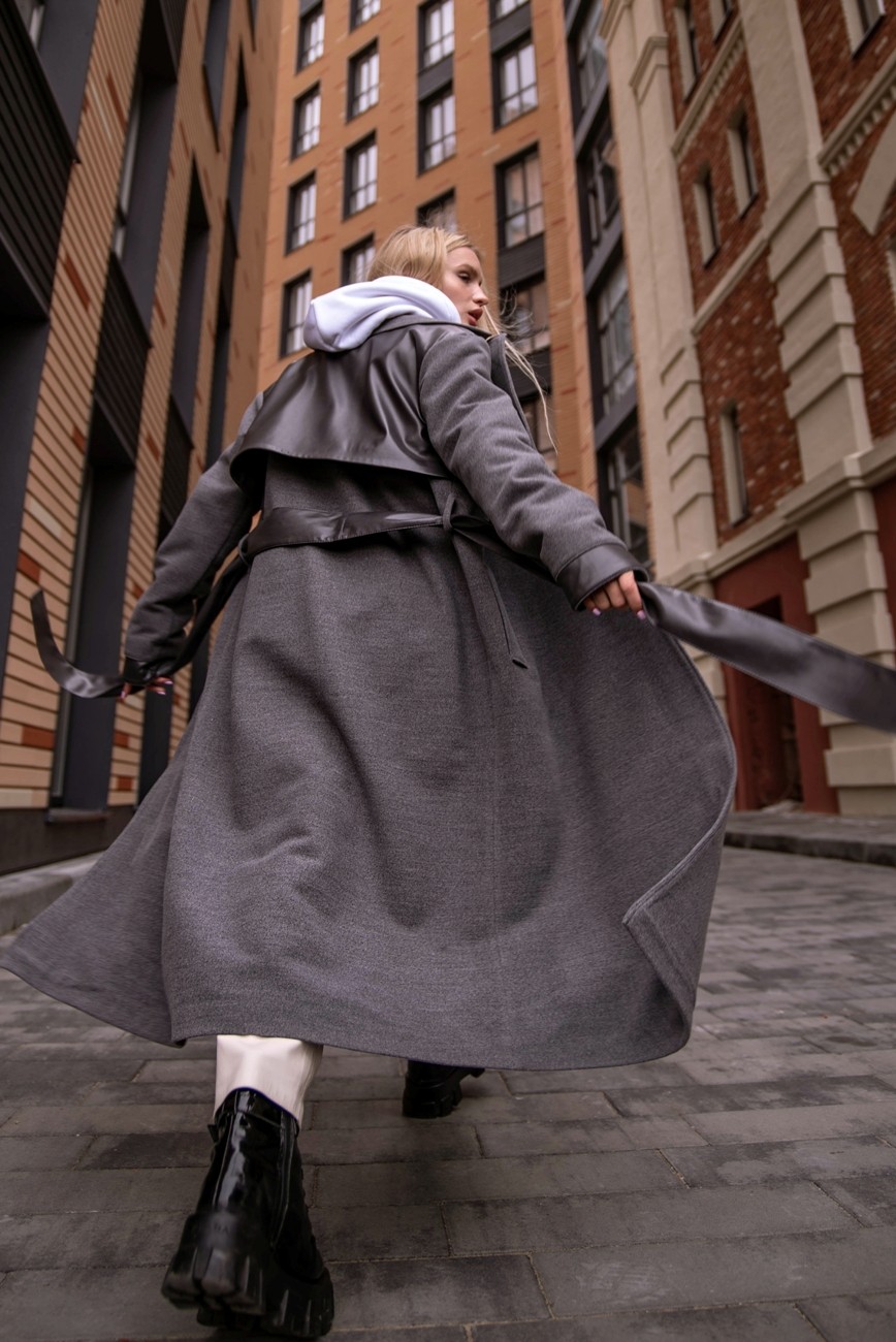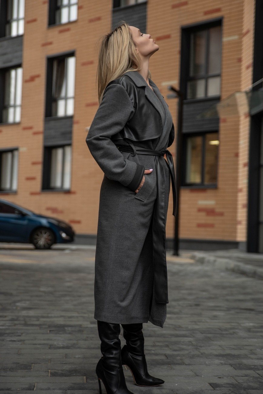 Пальто виконано з м'якого кашіміра. Вставка еко-шкіра. Має в комплекті пояс. Размір єдиний: 44-48 ПОГ 55 см. Довжина 123 см. Рукав-реглан: вимір від шиї 78 см (17 см від коміра до спущеного плеча + 62 см. Рукав з відворотом) ПОБ 58см.