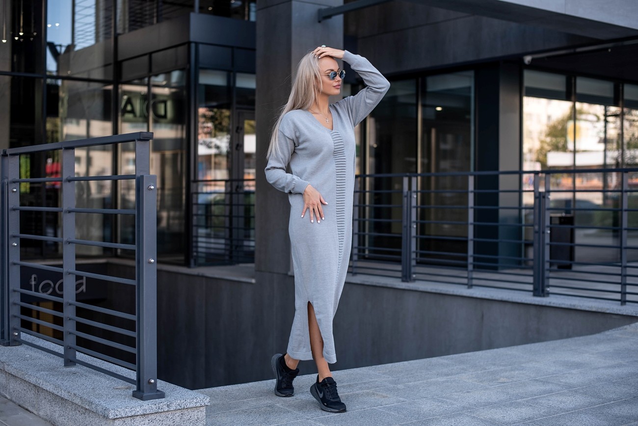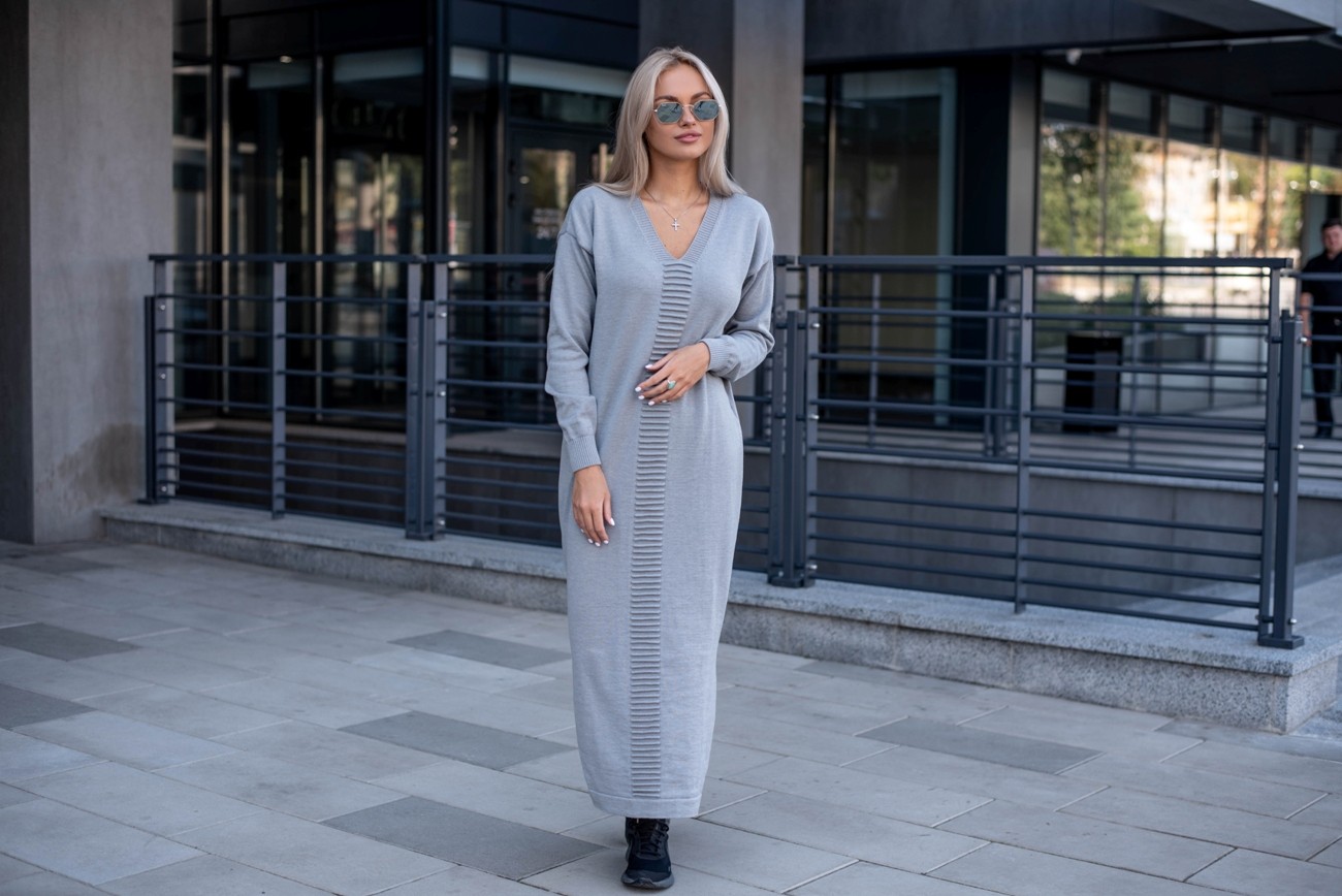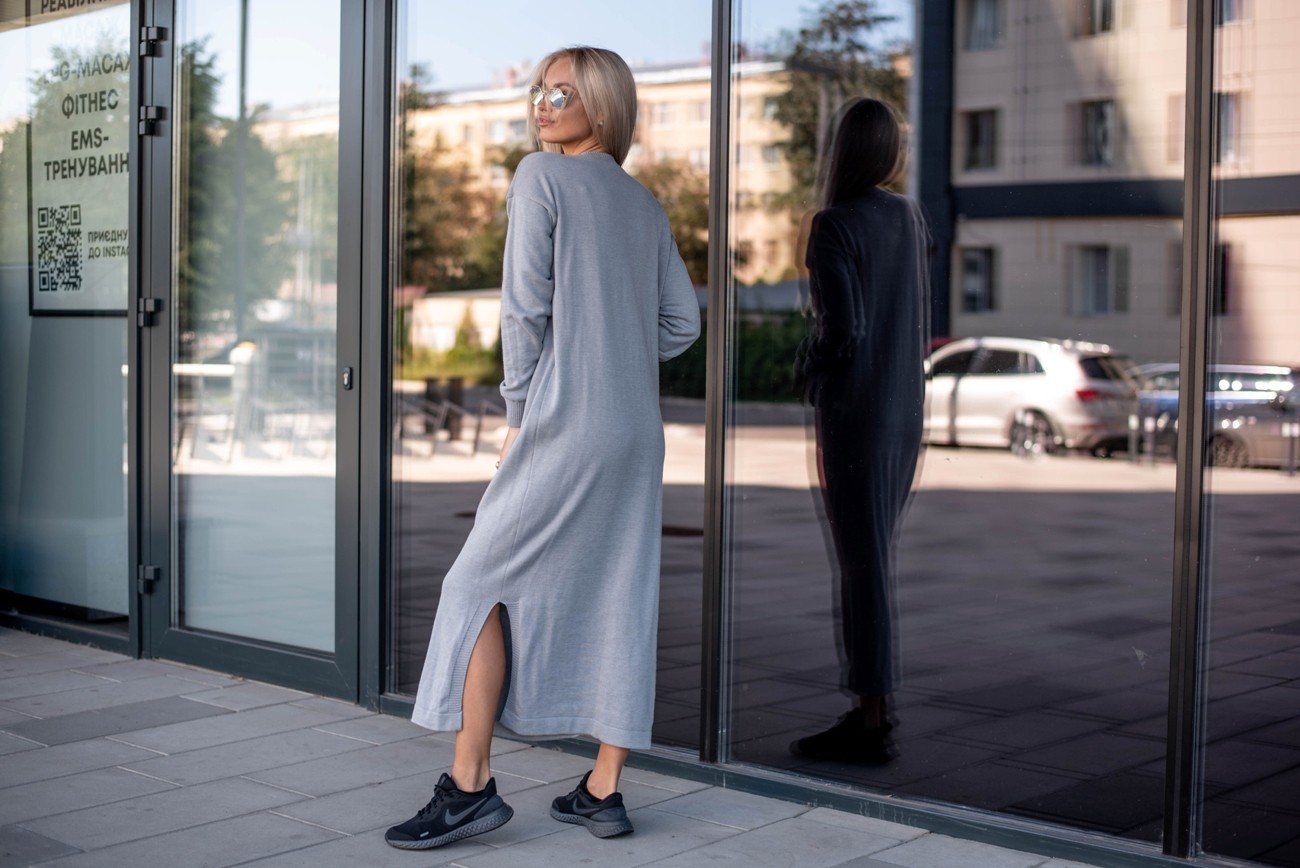 Сукня максі машинної в'язки виконана у вільному крої.Ідеально сидить, як з поясом, так і без (пояс в'язаний іде в комплекті). S: Довжина 128 см. ПОГ 52см. Довжина рукава 52см. Ширина по плечах 51 см.