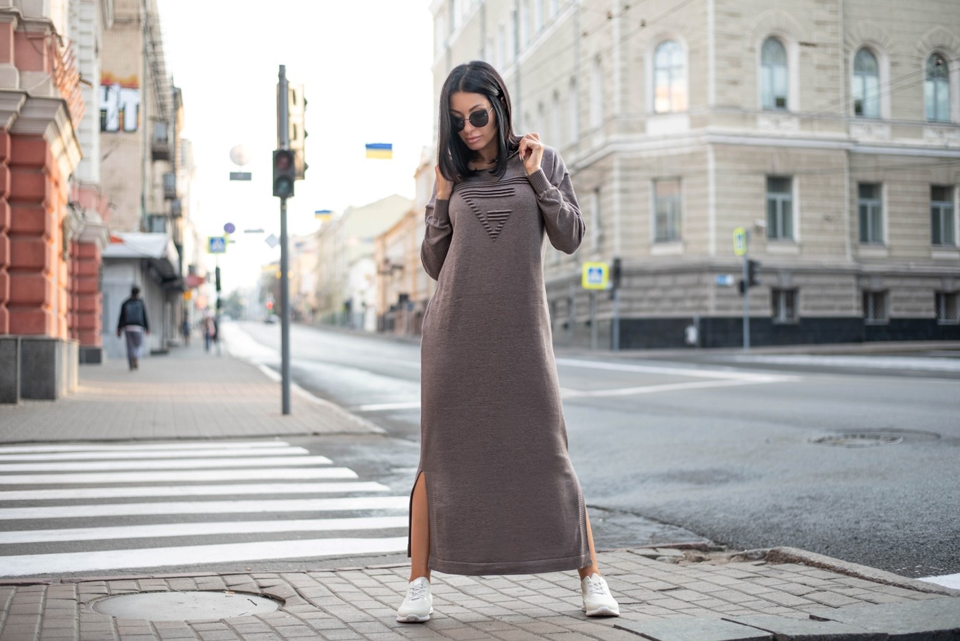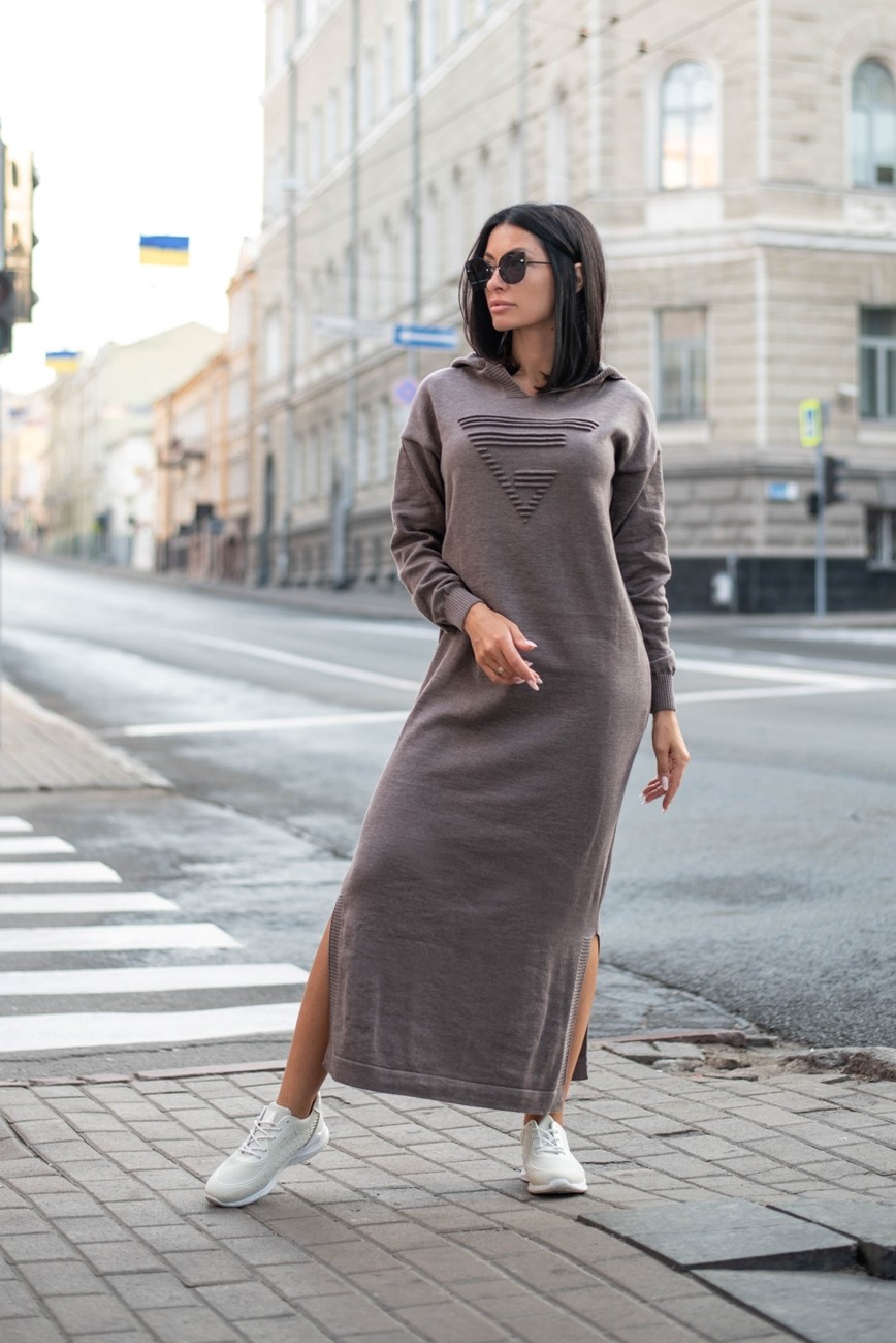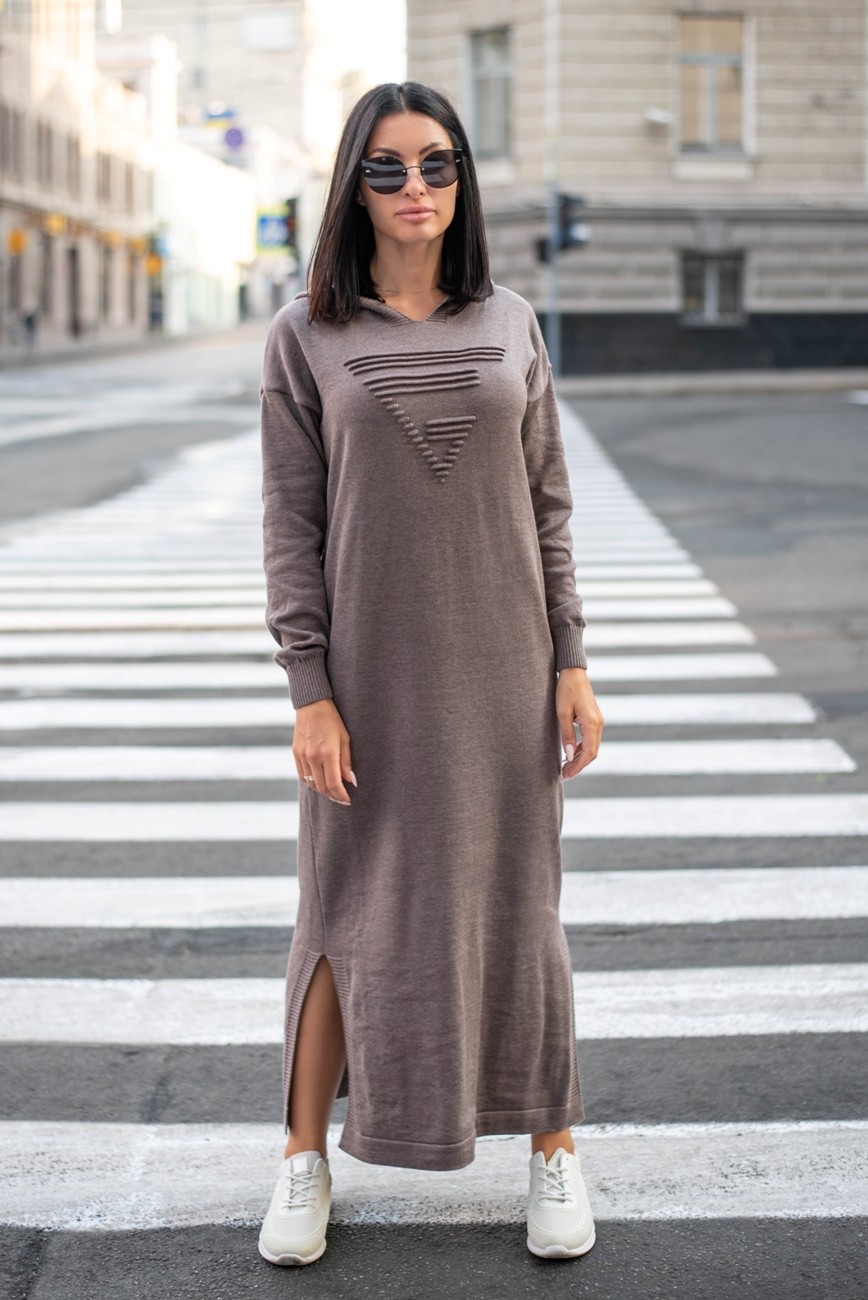 Тепла довга сукня з капюшоном - Машинна в'язка - "Агата" - Шоколад