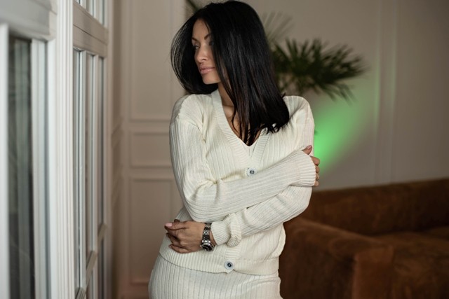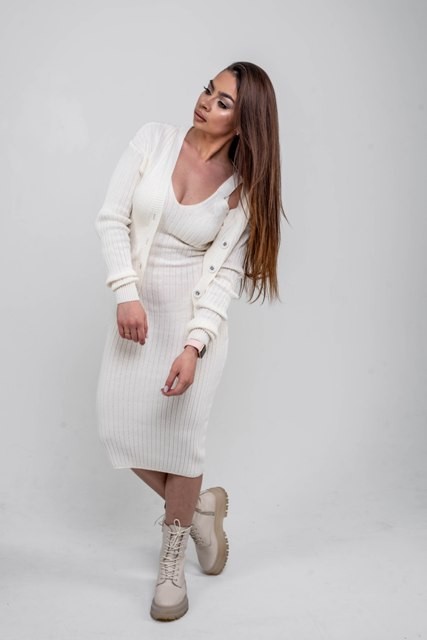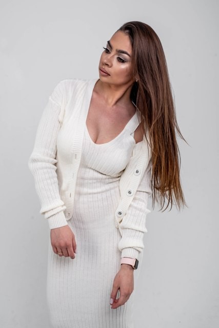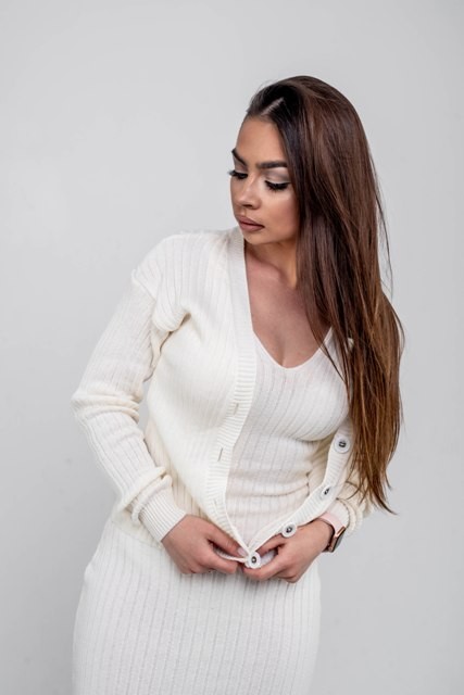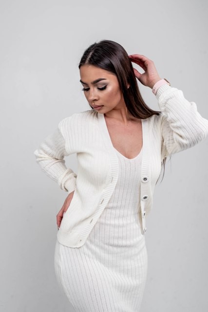 Коротка в'язана кофта на гудзиках з костюма "Елізабет" підкреслить силует і додасть ще більше жіночності.